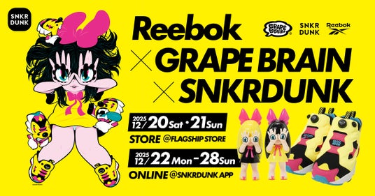 「SNKRDUNK(スニーカーダンク)」(以下、スニダン)を運営する株式会社SODA(本社:東京都渋谷区、代表取締役CEO:内山 雄太、以下SODA)は、アイコニック且つ革新的なスポーツカルチャーブランド「Reebok(リーボック)」と独自の世界観で“妖怪”をテーマにしたキャラクターを展開する「GRAPE BRAIN(グレイプ ブレイン)」とのコラボレーションで、限定デザインのスニーカーと人気キャラクター「にぎるちゃん」のソフビがセットになったスペシャルボックスを発売いたします。