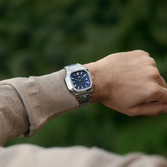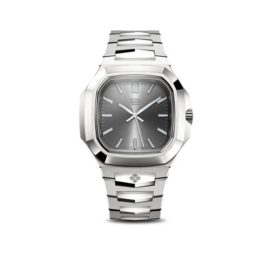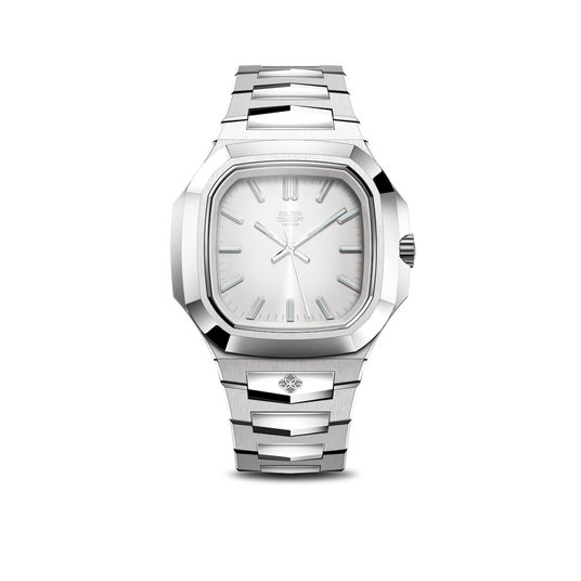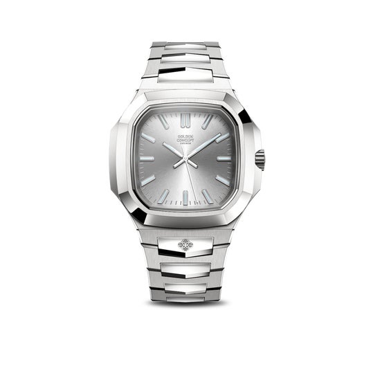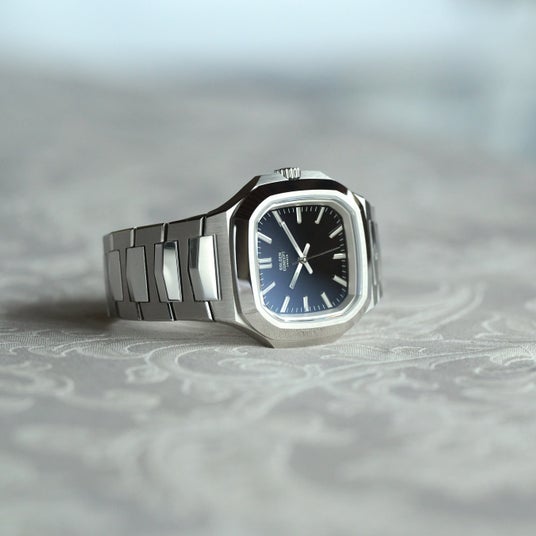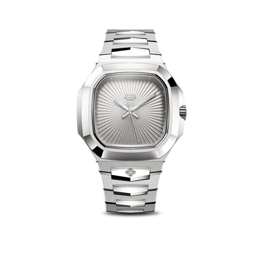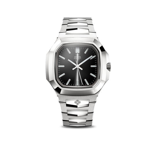 サイズは40mm。手首にすっと収まるこのプロポーションは、大きすぎず小さすぎない絶妙なバランスで、日常の動きの中でも自然に存在感を放ちます。袖口からわずかにのぞく姿は控えめでありながら、一目で“上質”とわかる佇まい。丁寧に整えられた面の切り替えや光の受け方が静かな陰影を生み、洗練された高級感をまとった仕上がりです。