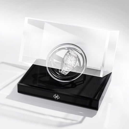 すべてのタイムピースには専用ワインダーが付属します。静かに円を描くような回転がムーブメントを動かし続け、いつでも正確に動き出せる状態を保ちます。透明感のあるクリアパネルと建築的なラインで構成されたデザインは、日常空間に静かな存在感をもたらすインテリアオブジェとしても機能。