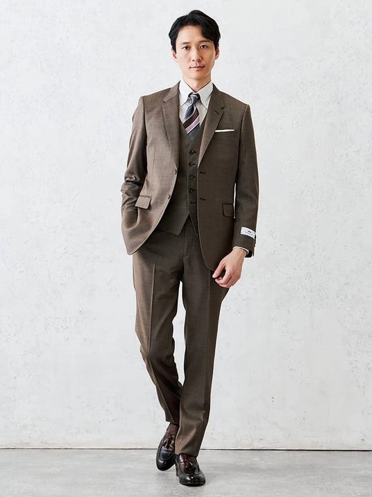 本コレクションは、ビジネスシーンとカジュアルシーンの垣根を越えた新しいスタイルを提案します。ポリエステル70%・ウール30%の特殊素材を採用し、デニムの風合いを持ちながらスーツとしての品格と機能性を兼ね備えています。デニムライクな織り目と縦落ち感のある素材感が特徴で、カジュアルさと上品さを両立。ベージュ、カーキ、ブルーの3色展開で、ビジネスカジュアルからセミフォーマルまで幅広いシーンに対応します。本格スーツ仕立てとデニムディテールの融合