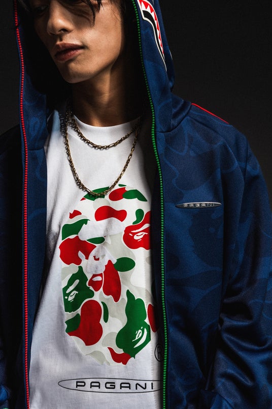 同シリーズには、セットアップで着用可能なボトムスをはじめ、イタリアのナショナルカラーにインスパイアされたCAMOをあしらったAPE HEAD Tシャツ、ダウンベスト、さらにパガーニ創業者オラチオ・パガーニ氏をフィーチャーした特別仕様のBABY MILO(R) Tシャツも登場。