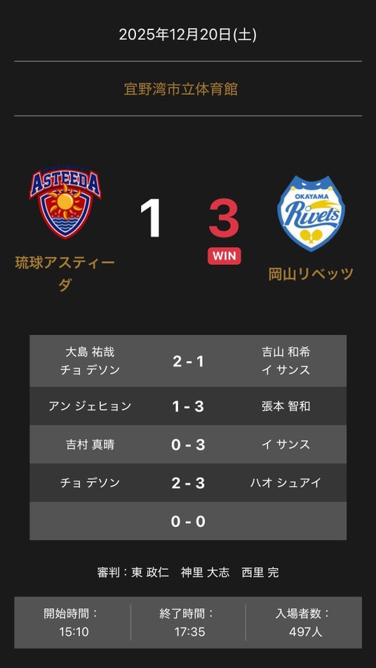 ノジマTリーグ 2025-2026シーズン 公式戦 琉球アスティーダvs岡山リベッツ 試合結果