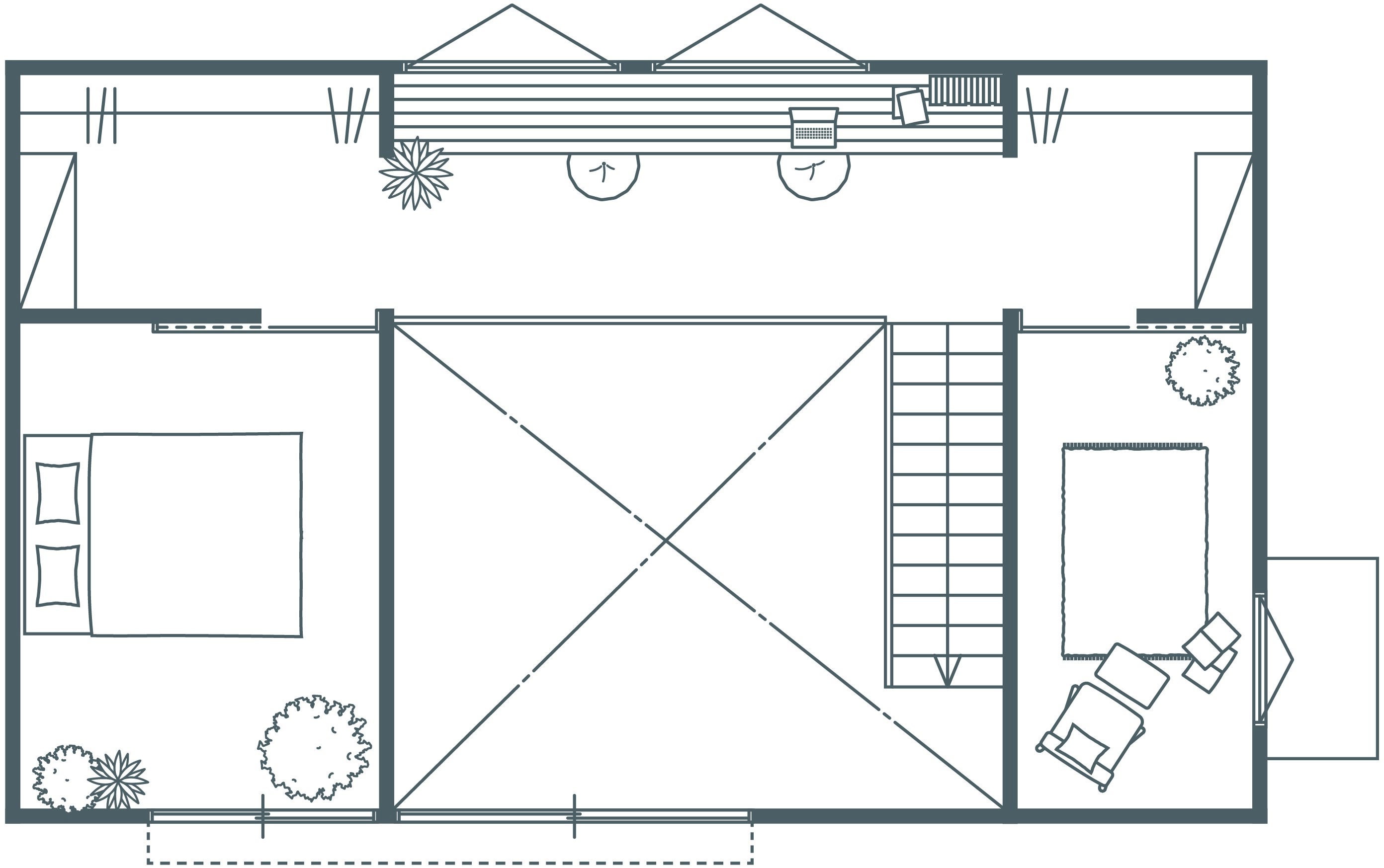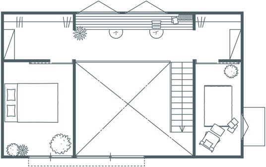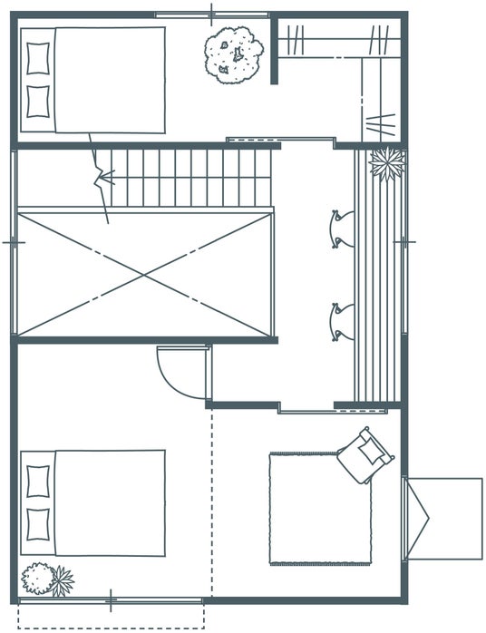 2階にはロフト風のシェアスペースと、死角を利用してゆるや かにつながりつつも一人の時間を確保できる個室を配置