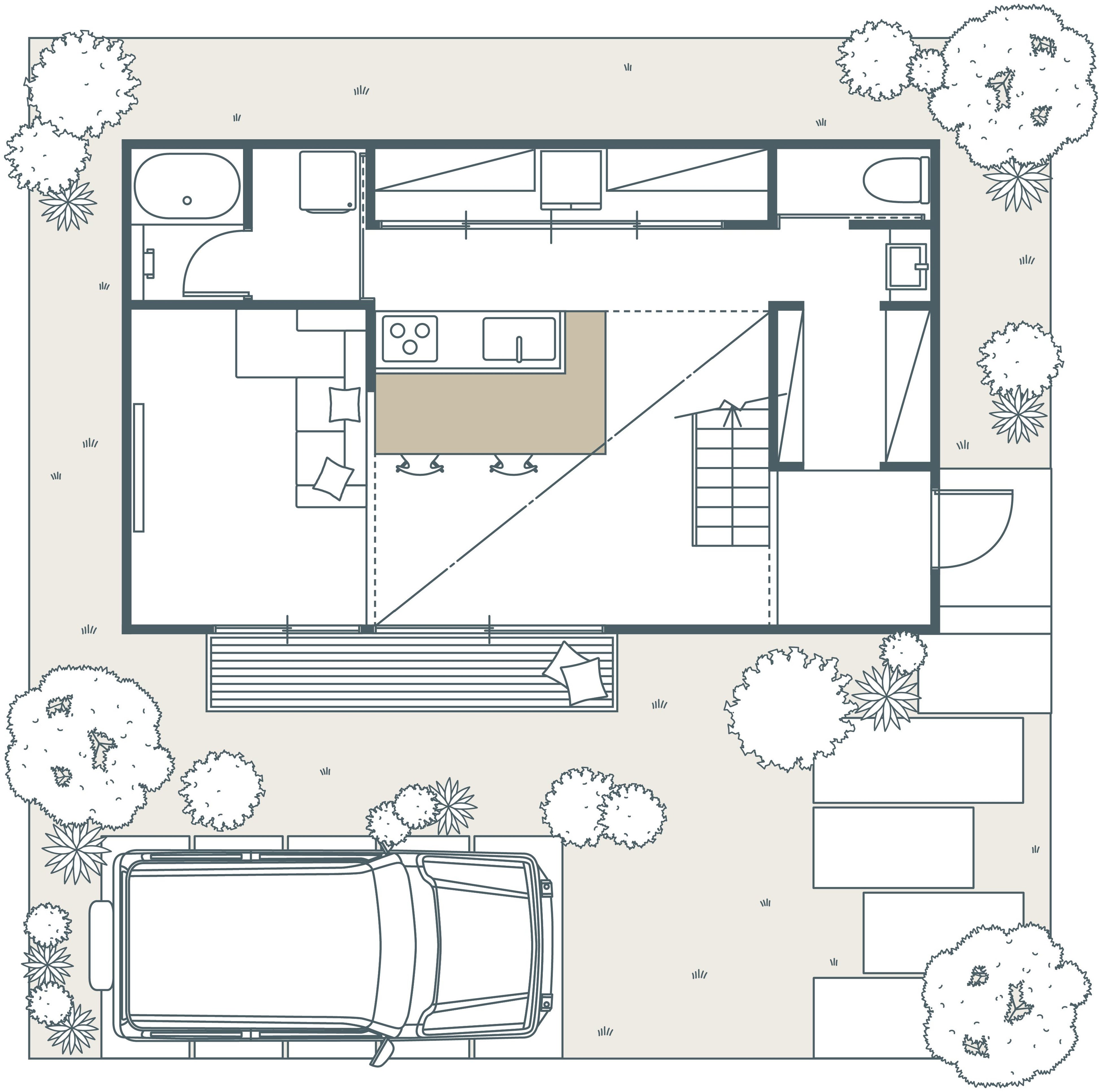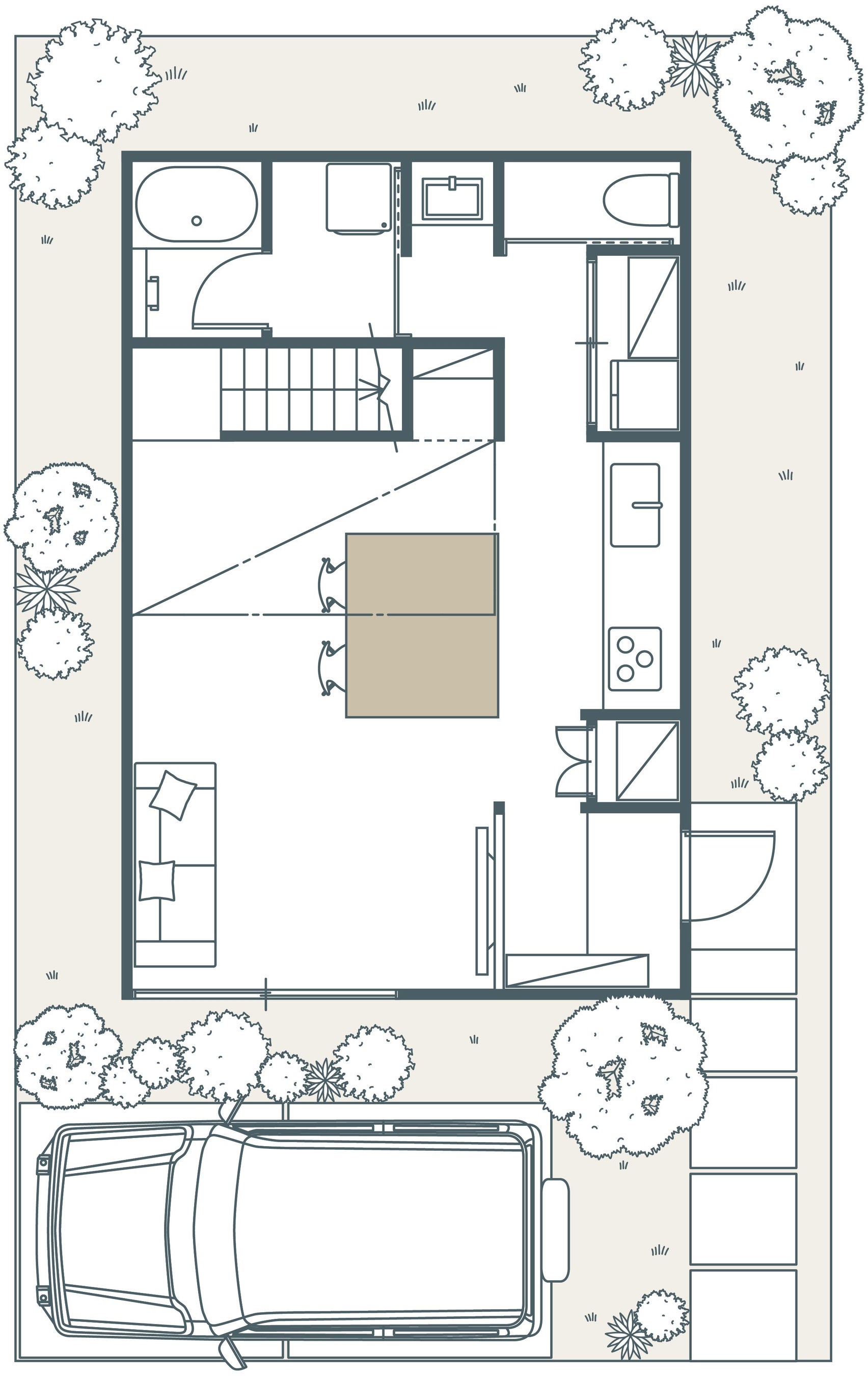 家族や友人と過ごす「シェア空間(パブリック)」と、一人の時間を大切にする「プライベート空間」を高低差で区切り、緩やかにつながる暮らしを実現します。