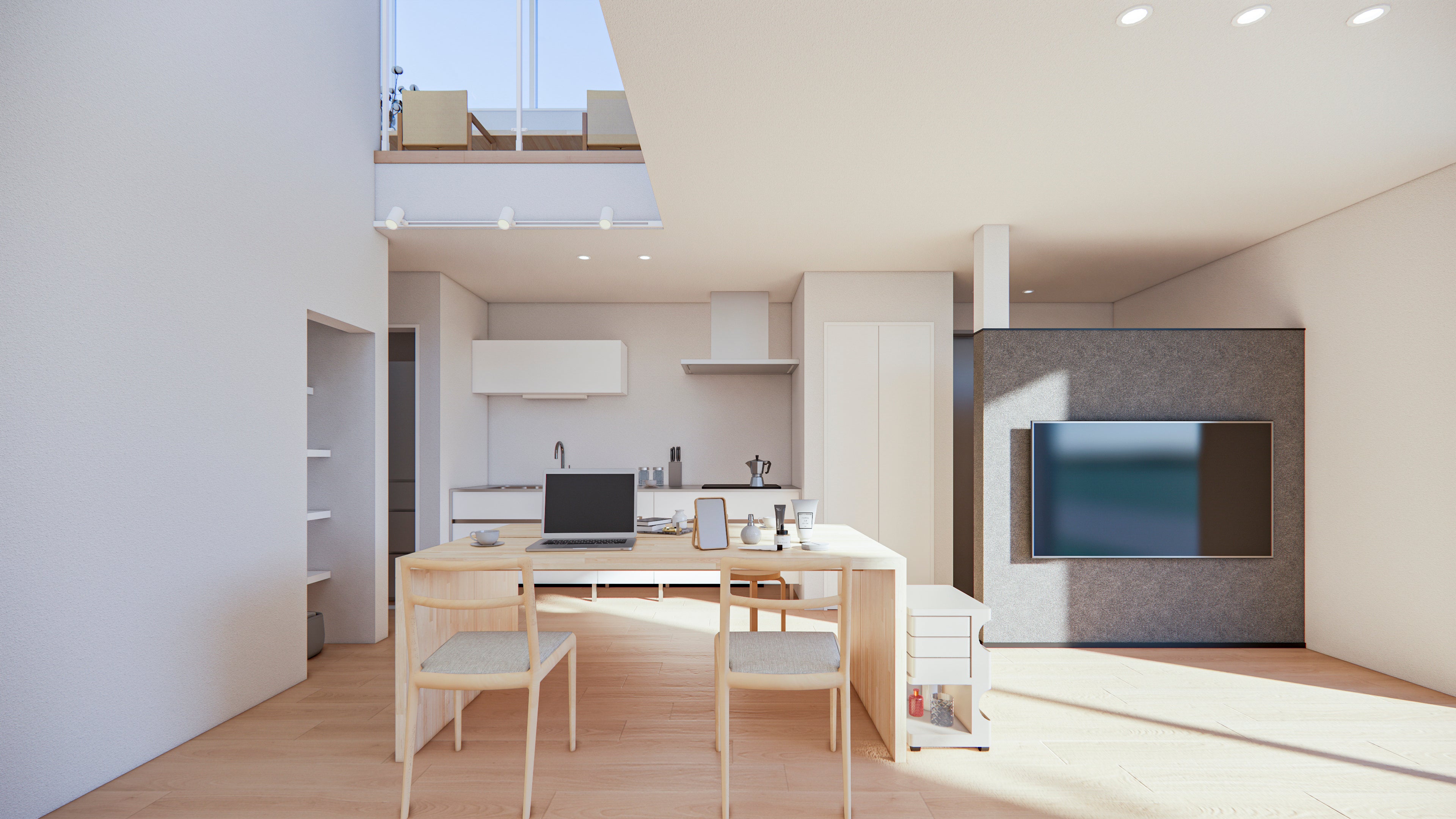 家族の繋がりを保ちながら、個人の時間も尊重できるよう、空間を高低差で区切り、緩やかにつながる暮らしを実現しています。