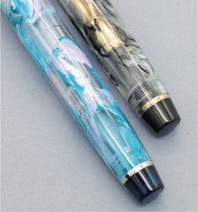 ■『VEILIO 万年筆』透明ベースの国産アクリル切削材を使用し、マーブル柄を万年筆の“顔” であるペン先を覆うベールに見立て、ベール(veil)と色(iro)を組み合わせた「VEILIO」シリーズ。