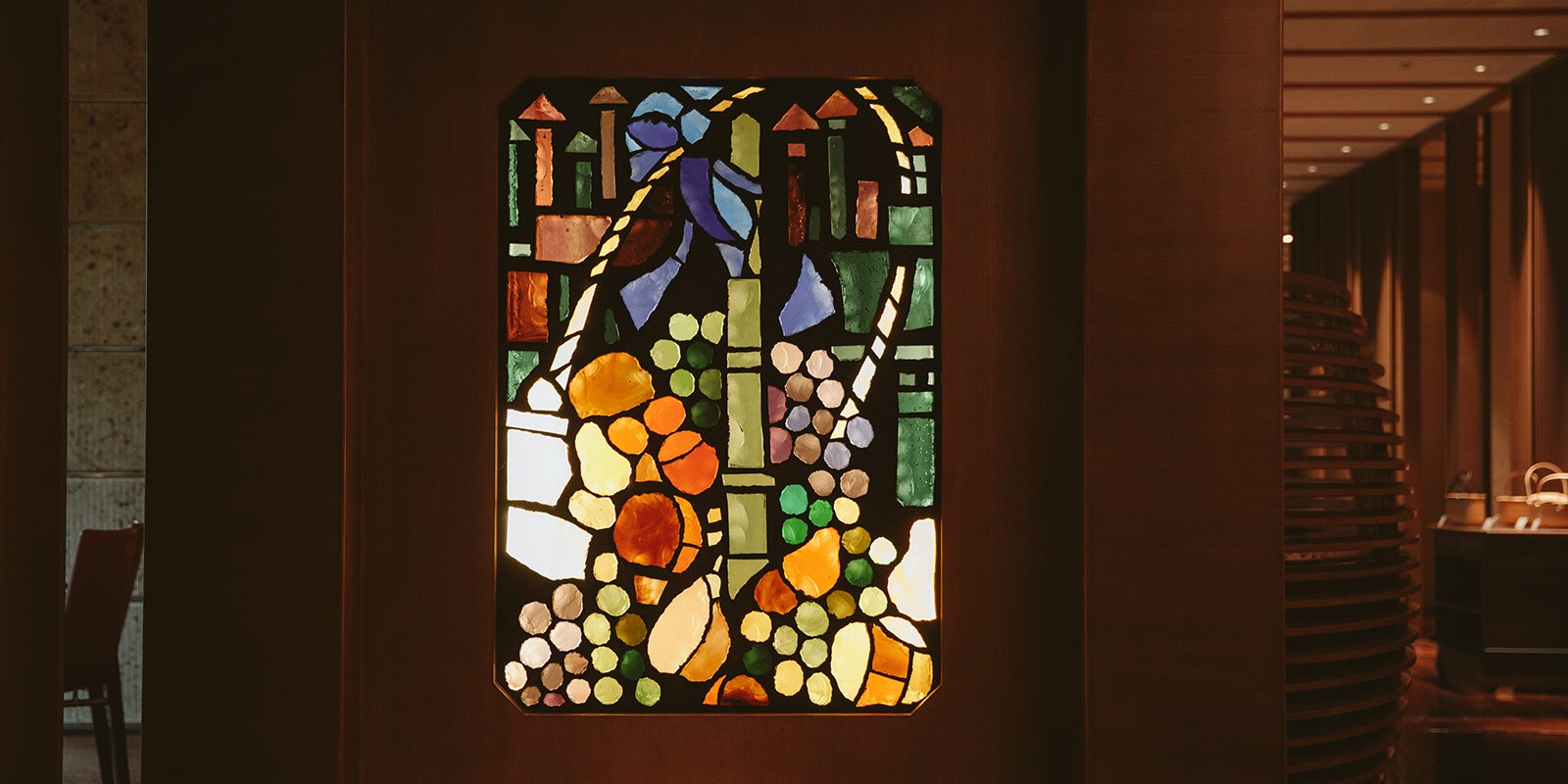 伝説のレストラン”西洋膳所ジョンカナヤ”に運営当時に配されていた"スカルプチャードグラス”(写真は鬼怒川金谷ホテル)