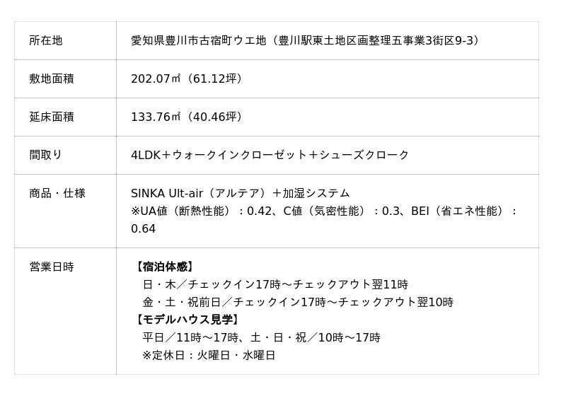 株式会社サーラコーポレーション(本社:愛知県豊橋市、代表取締役社長:神野 吾郎)の連結子会社で、愛知県全域および静岡県遠州・三重県東部・岐阜県南部地域において住宅事業を手掛けるサーラ住宅株式会社(本社:愛知県豊橋市、代表取締役社長:大場 吉恭)は、昨今の電気代高騰と記録的な猛暑という社会背景を受け、ZEH基準を上回る断熱性能を有し、家庭用エアコン1台で家中にここちよい空気を循環させる全館空調システムを搭載する「SINKA Ult-air(アルテア)」をベースとした宿泊体感型モデルハウス「お泊まりハウス」を愛知県豊川市に開設し、2026年1月15日から宿泊・見学サービスの提供を開始します。