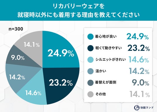 - 就寝時以外に着用する理由は「着心地が良い」「軽くて動きやすい」が上位