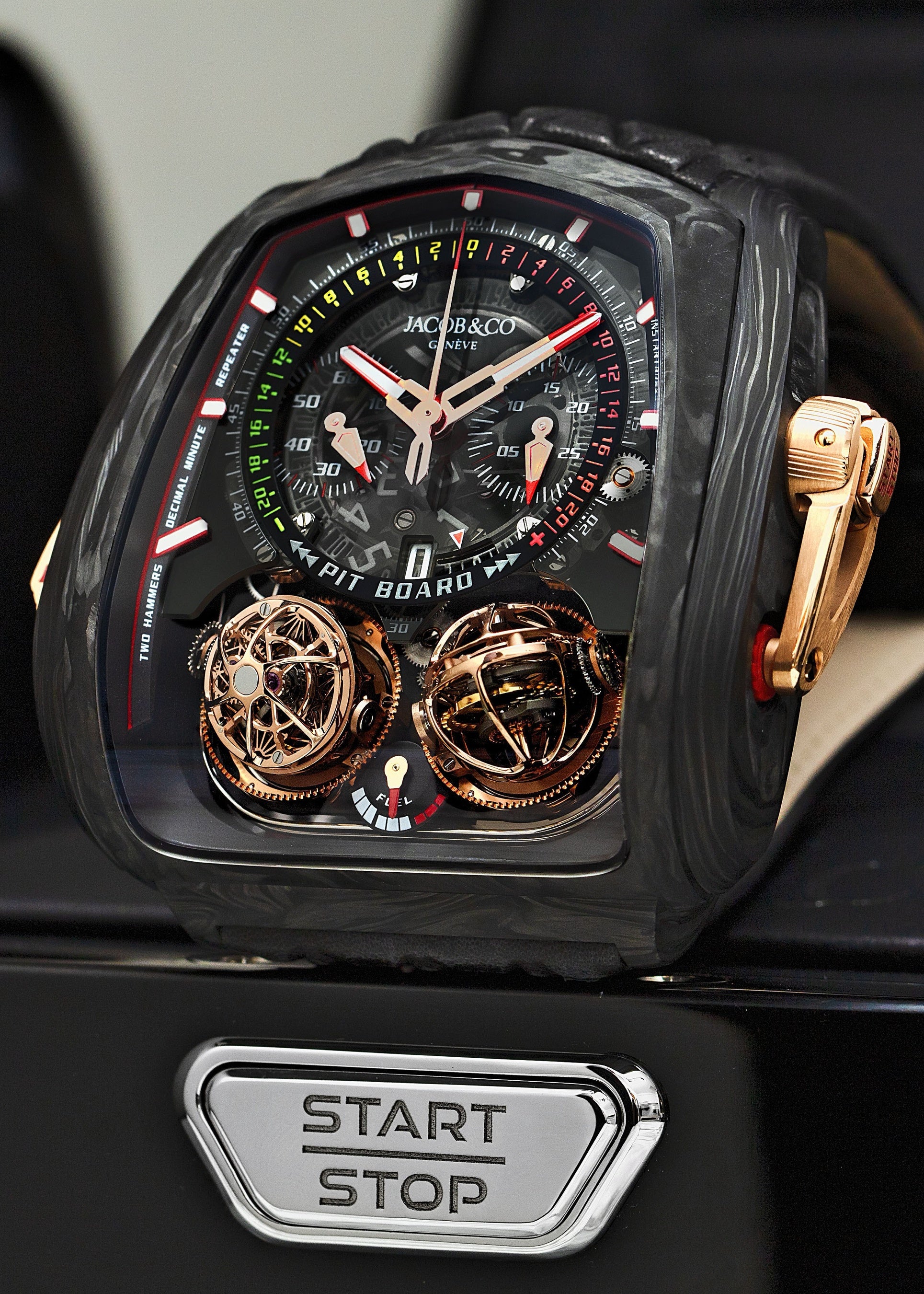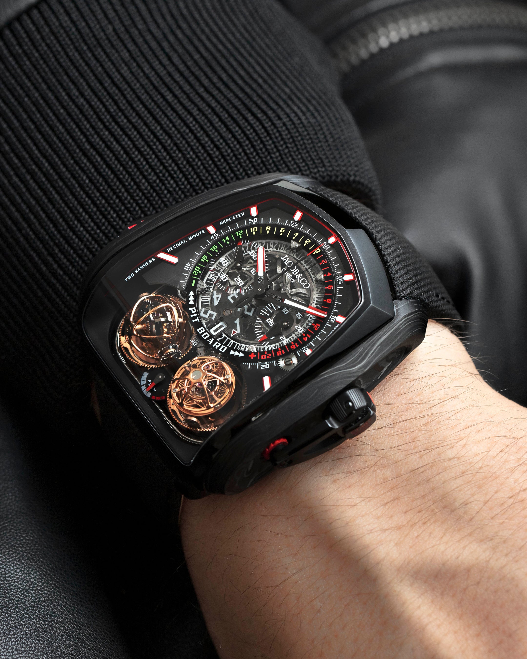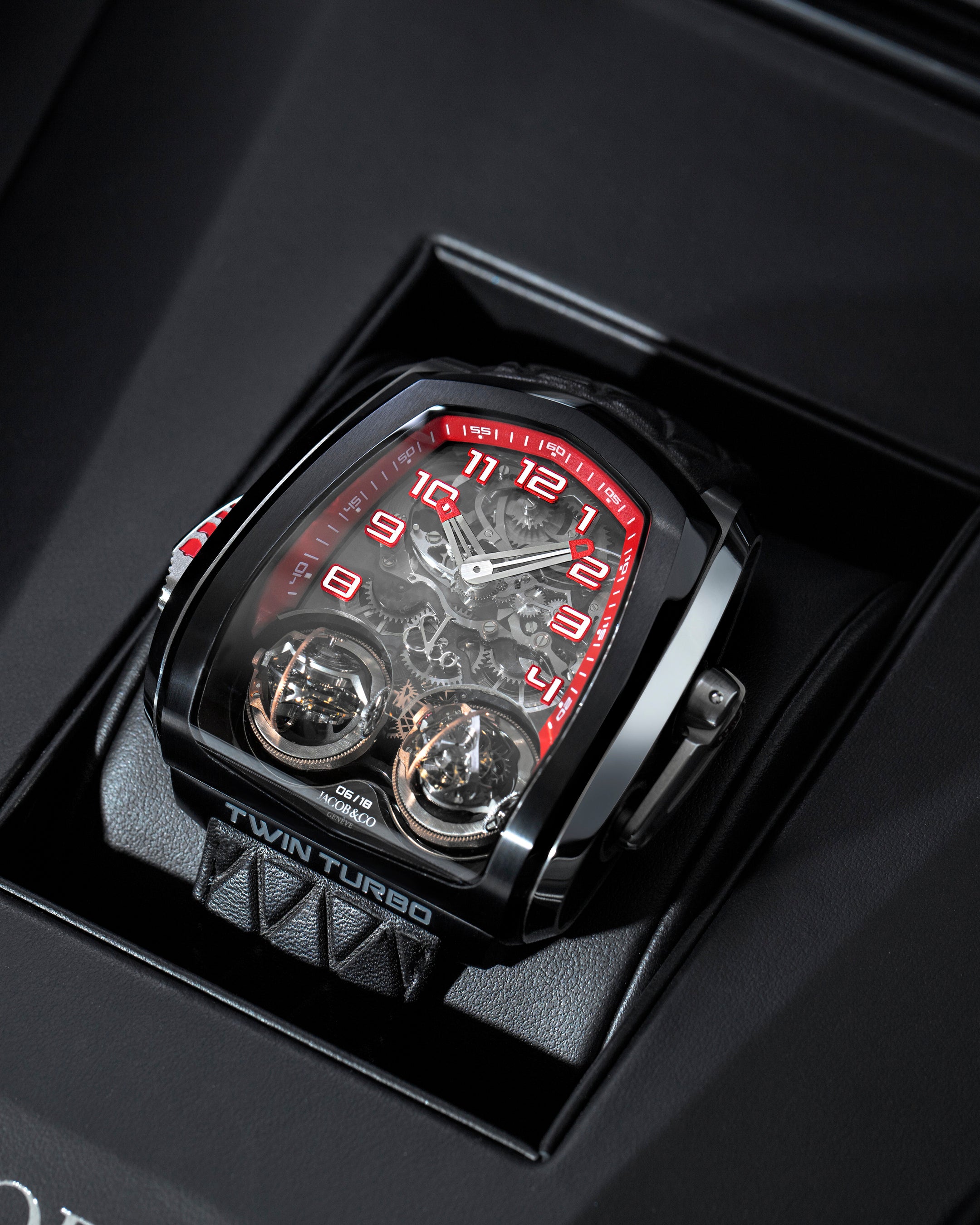 2018年、ジェイコブ&コーは「ツインターボ」を発表しました。ツイン3軸フライングトゥールビヨンとミニッツリピーターを同時に搭載した、世界初の腕時計が誕生したのです。また、そのフォルムはレーシングマシーンをイメージしてデザインされ、左右に配置された2基のトゥールビヨンを明確に視認できる構成により複雑機構そのものを造形として成立させています。