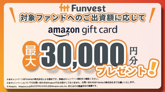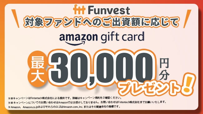 本ファンドへ出資していただいた投資家の皆様を対象として、出資額に応じて最大30,000円分のAmazonギフトカードをプレゼントするキャンペーンも併せて実施いたします。