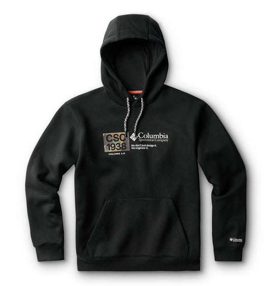 快適なコットン混素材を使用し、コロンビアのアーカイブに残るクラシックなハンティングギアから着想を得たシグネチャーグラフィックプリントを配したフーディ。調節可能なフード、カンガルーポケット、リブ仕様の袖口と裾を備えています。
