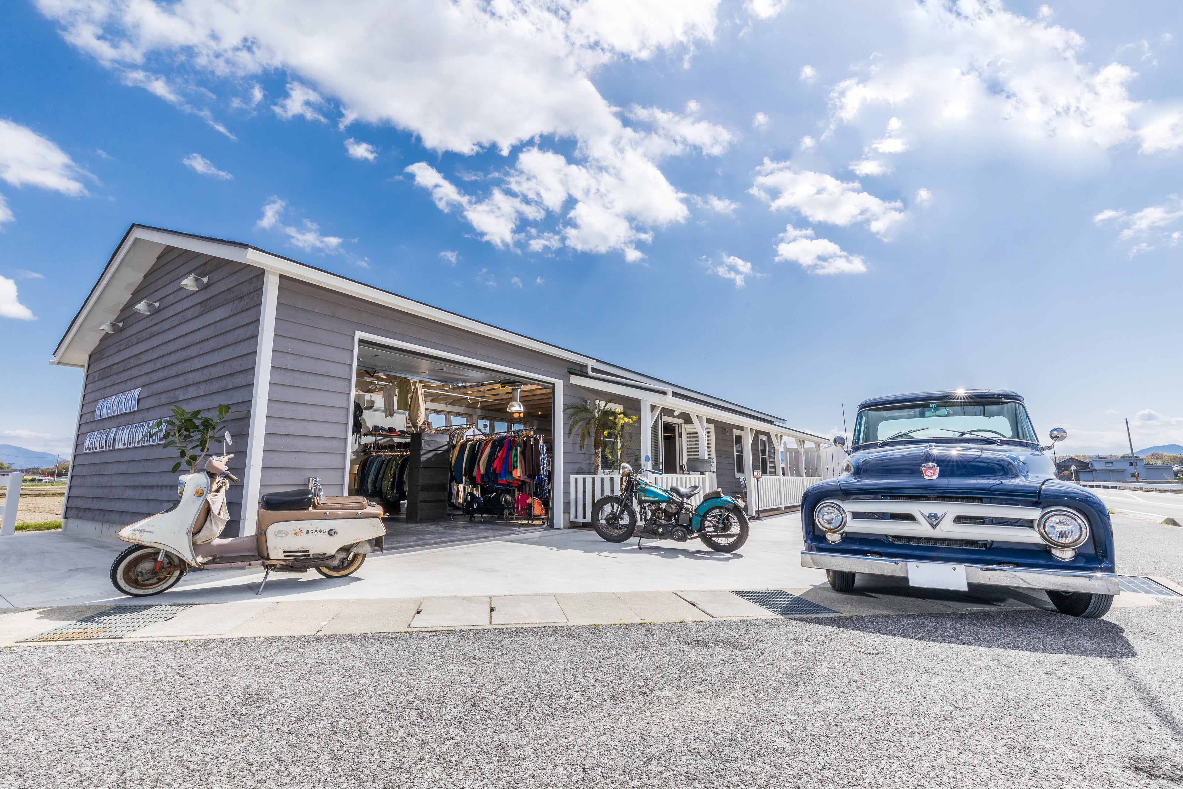 実際にアメリカへ買い付けを行って販売されているVINTAGE CLOTHINGのお店。併設するCAFEも経営されておりオーナーのこだわりが詰まったモノに似合う本格的なアメリカンガレージとなっております。
