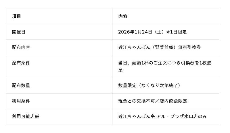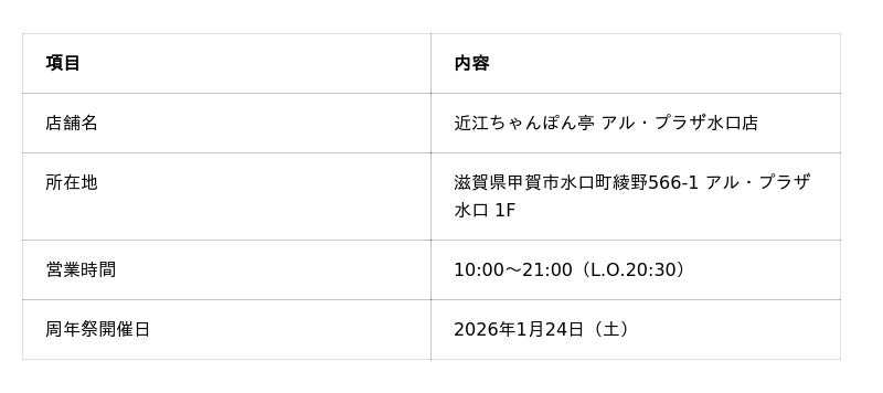 「近江のちゃんぽんをニッポンのちゃんぽんに!」を掲げるドリームフーズ株式会社(本社:滋賀県彦根市/代表取締役社長:山本英柱)は、当社が運営する「近江ちゃんぽん亭 アル・プラザ水口店」が2026年1月に開店7周年を迎えることを記念し、2026年1月24日(土)に「7周年記念 周年祭」を開催いたします。