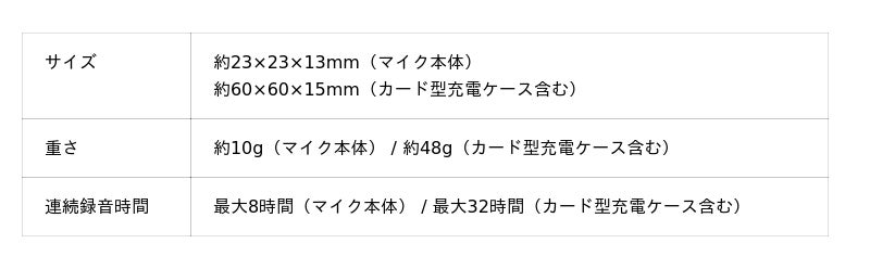 - 世界最小・最軽量のコンパクトさ:マイク本体はわずか約10gと、世界最小・最軽量のコンパクト設計(※2026年1月時点、自社調べ)。マイク本体のみを首元や襟元に装着したり、充電ケースごとスマートフォンに装着したりと、多様な装着方法で場所を選ばず使用できます。最大5m先の音声までクリアに捉えます。