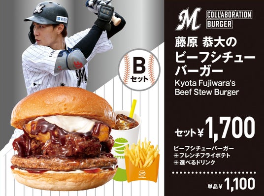 商品概要:今シーズンからの新商品として、藤原 恭大選手が好きなデミグラスソースを使用したコラボバーガーが登場します。