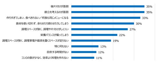 ■ 一人暮らしの自炊のストレス上位は「献立」「後片付け」「作りすぎ」