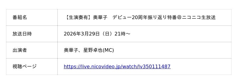 2026年3月29日(日)に奥華子の20周年を記念したニコニコ生放送の特番が決定いたしました。