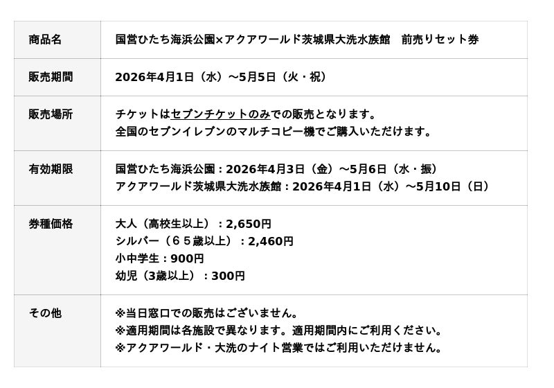国営ひたち海浜公園(ひたちなか市)、アクアワールド茨城県大洗水族館(大洗町)では、2026年4月1日より、両施設に入園可能な「前売り入園セット券」を『セブンチケット』で販売いたします。