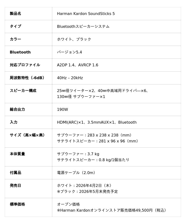 ハーマンインターナショナル株式会社(本社:東京都千代田区、代表取締役社長:桑原拓磨)は、優れた音響技術と洗練されたデザインの融合で世界中の音楽ファンから愛されるオーディオブランド「Harman Kardon (ハーマンカードン)」から、Bluetoothスピーカーシステム「SoundSticks 5」を2026年4月2日(木)より順次発売いたします。