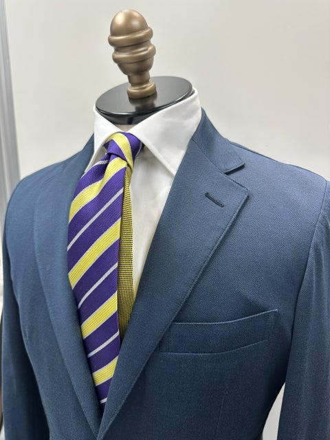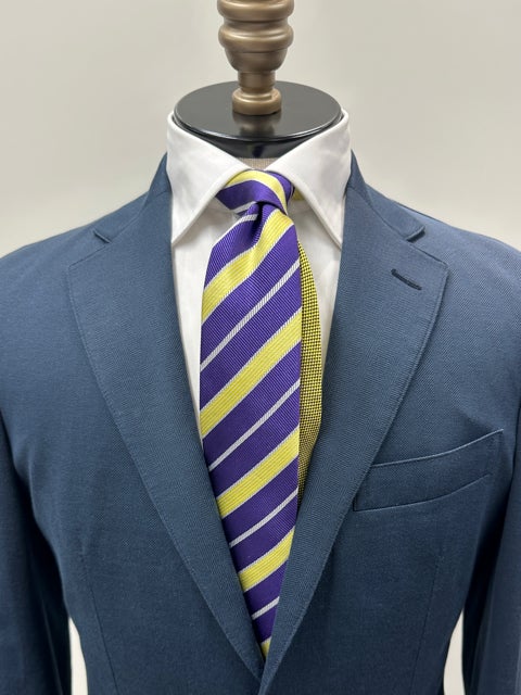 本商品は、2025-26シーズンにおいてサンロッカーズ渋谷のヘッドコーチ陣が着用しているモデルと同仕様の特別アイテムです。チームカラーであるイエローと、ホームタウン渋谷区のイメージカラーであるパープルを組み合わせたレジメンタルストライプを採用し、ビジネスシーンにも取り入れやすい洗練されたデザインに仕上げました。