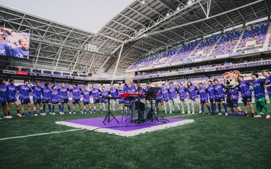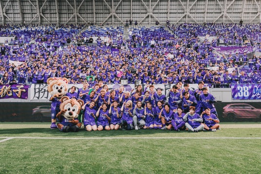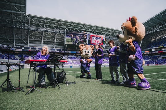 試合の興奮冷めやらぬ中、ハラミちゃんが再びピッチへ。大祭典の締めくくりとなる極上の演奏がスタジアムに響き渡りました。最後はハラミちゃんと選手たち、そしてスタンドの皆様と一緒に記念撮影! 朝の桜から始まり、笑顔と音楽、そしてサッカーの熱狂で駆け抜けた『自由すぎる女王の大祭典』は、最高の笑顔とともに幕を閉じました。
