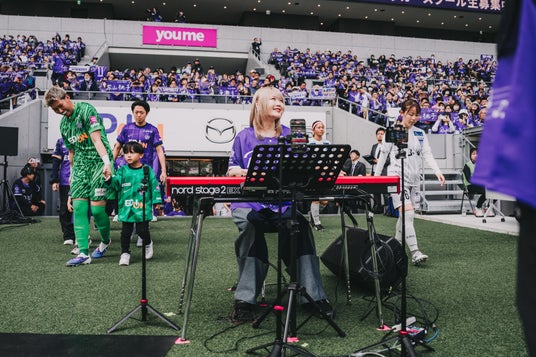 スタジアム場内では昨年も大好評だったフォトスポット「大祭典☆わっしょいフォト」で多くの方が撮影しにぎわう中、ついにあのゲストがピッチに降臨!チャンネル登録者数・SNS総フォロワー350万人超えの超人気ポップスピアニスト、ハラミちゃんによる「WARM UP SHOW!!!」がスタート。極上の音色がスタジアムを包み込み、観客のボルテージはキックオフに向けて急上昇!