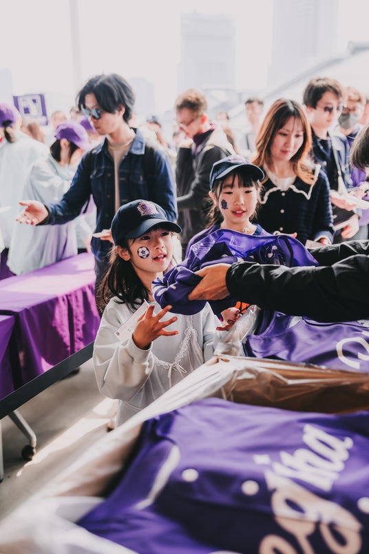 ゲートが開くと、先着20,000名様に選手考案の「レジーナ大祭典ベースボールシャツ」をプレゼント! さらに、自分だけのオリジナルシャツにカスタマイズできる「限定ワッペン」も大好評。お揃いのアイテムを身につけることで、スタジアム全体の熱気と一体感が一気に加速しました。