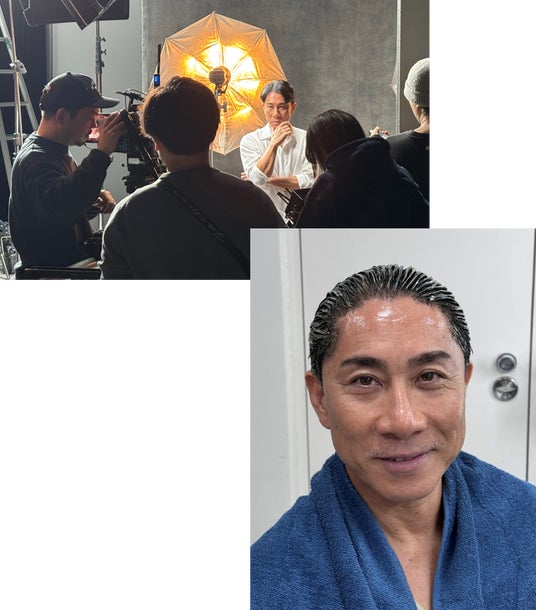 撮影は都内スタジオで行われました。今回の目玉は、なんといっても「撮影中に実際に染める」というリアルな演出です。まずは白髪の状態でのシーンを撮影。その後、前園さんには実際に楽屋で「サロン ド プロ ワンプッシュメンズカラー(白髪用)」を使用していただきました。しばらくして、前園さんが楽屋から姿を現すと、その変身ぶりにスタジオ内からは「おぉー!」と大きな歓声と拍手が巻き起こりました。前園さんご自身も鏡を見ながら、新鮮なご自身の姿に満足げな表情を浮かべ、終始和やかな雰囲気での撮影となりました。