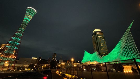 3.ホテルオークラ神戸は初のGREENライトアップ!神戸ポートタワー、神戸海洋博物館神戸市立博物館もGLION ARENA KOBEと共にGREENライトアップでお祝い!