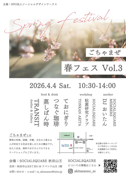特定非営利活動法人ソーシャルデザインワークス(本部所在地:福島県いわき市、代表:北山剛)が運営する障害福祉事業所「SOCIALSQUARE 秋田山王店」(秋田県秋田市)は、開所3周年を記念し、2026年4月4日(土)に地域交流イベント「ごちゃまぜ春フェス Vol.3」を開催します。