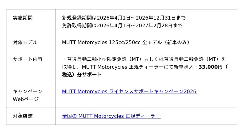 MUTT Motorcycles ライセンスサポートキャンペーン2026キャンペーン概要