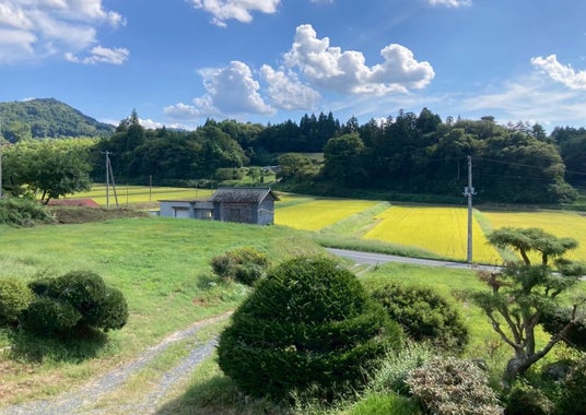 古民家2階からの景色。広大な田畑が広がる。