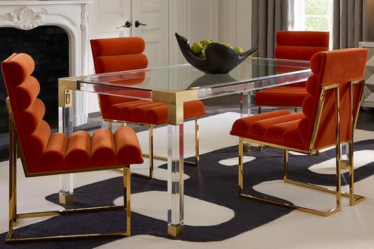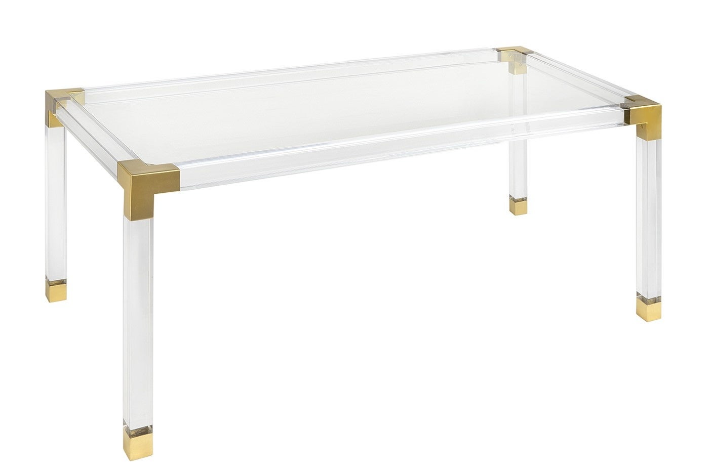 ジョナサン・アドラーで人気のジャックコレクションのダイニングテーブル。クリアアクリルのフレームにブラッシュドブラスのコーナー金具、天板に強化ガラスを組み合わせた「シンプルとグラマーの均衡」をそのままかたちにしたデザインです。幅約183cm × 奥行約97cm × 高さ約76cmで最大6名に対応し、住宅だけでなくコントラクト(業務用)環境にも適しています。視覚的な圧迫感を与えないアクリルの透明感は、空間を広く演出しながらも、ブラスの光沢が確かな存在感を加えます。「モダンアメリカングラマー」を体現する、ダイニングの象徴的なアイテムです。