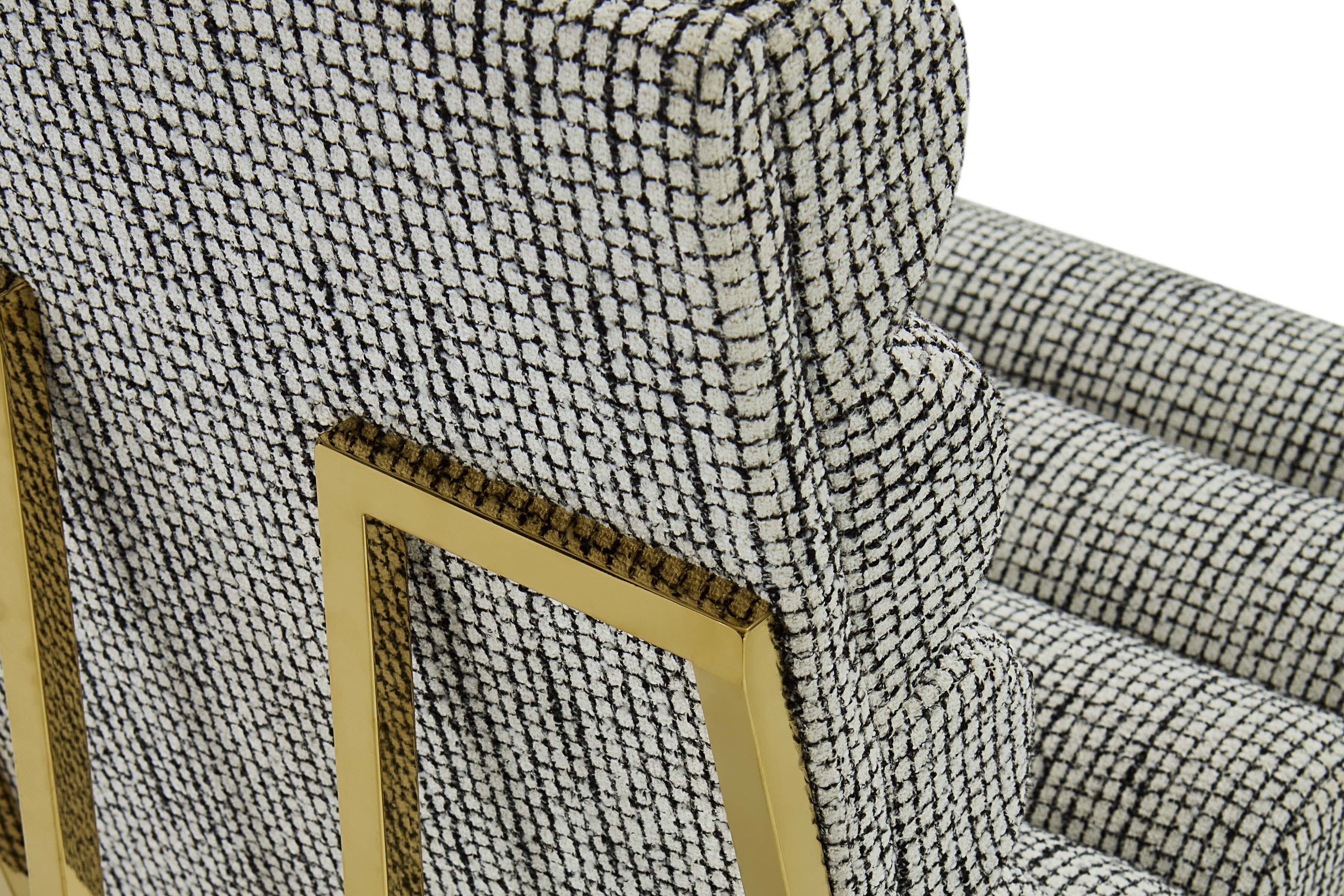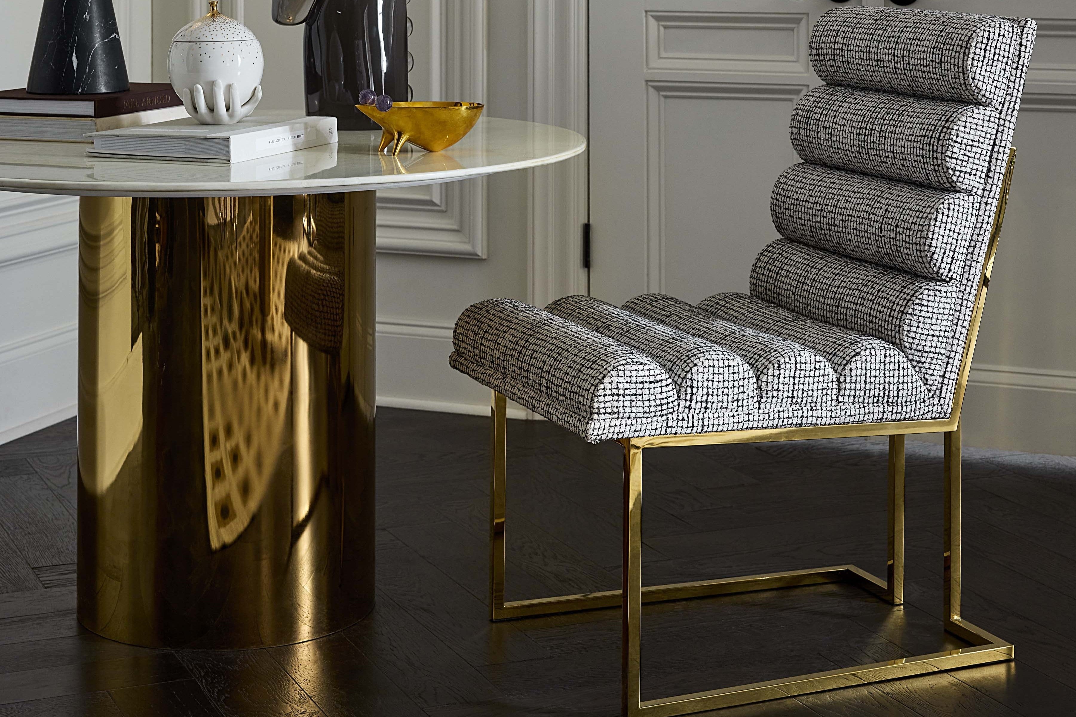1970年代モダニズムの誠実さを現代に再解釈した質感豊かなダイニングチェアです。削ぎ落とされた直線的なポリッシュドブラスフレームに、縦溝(チャネル)入りのタイトシートクッションを組み合わせることで、ミニマルな構造と確かな座り心地を両立しています。光の当たり方で表情が変わる、数量限定発売のクロスハッチ生地と、鏡面仕上げのブラスが見事な対比をなし、時代を超えたエレガンスをダイニングにもたらす一脚です。