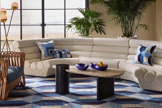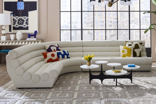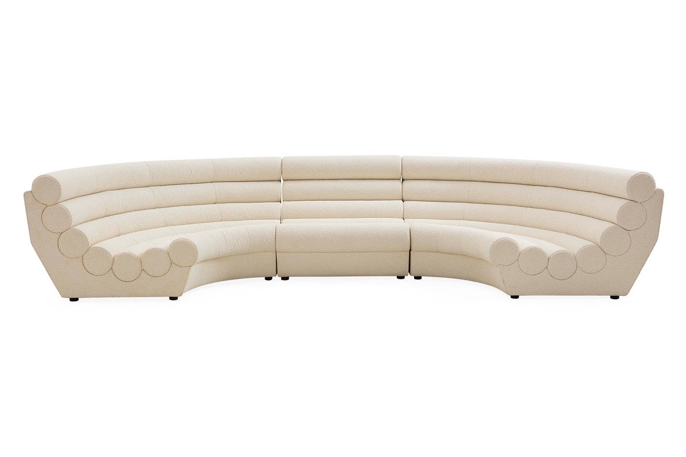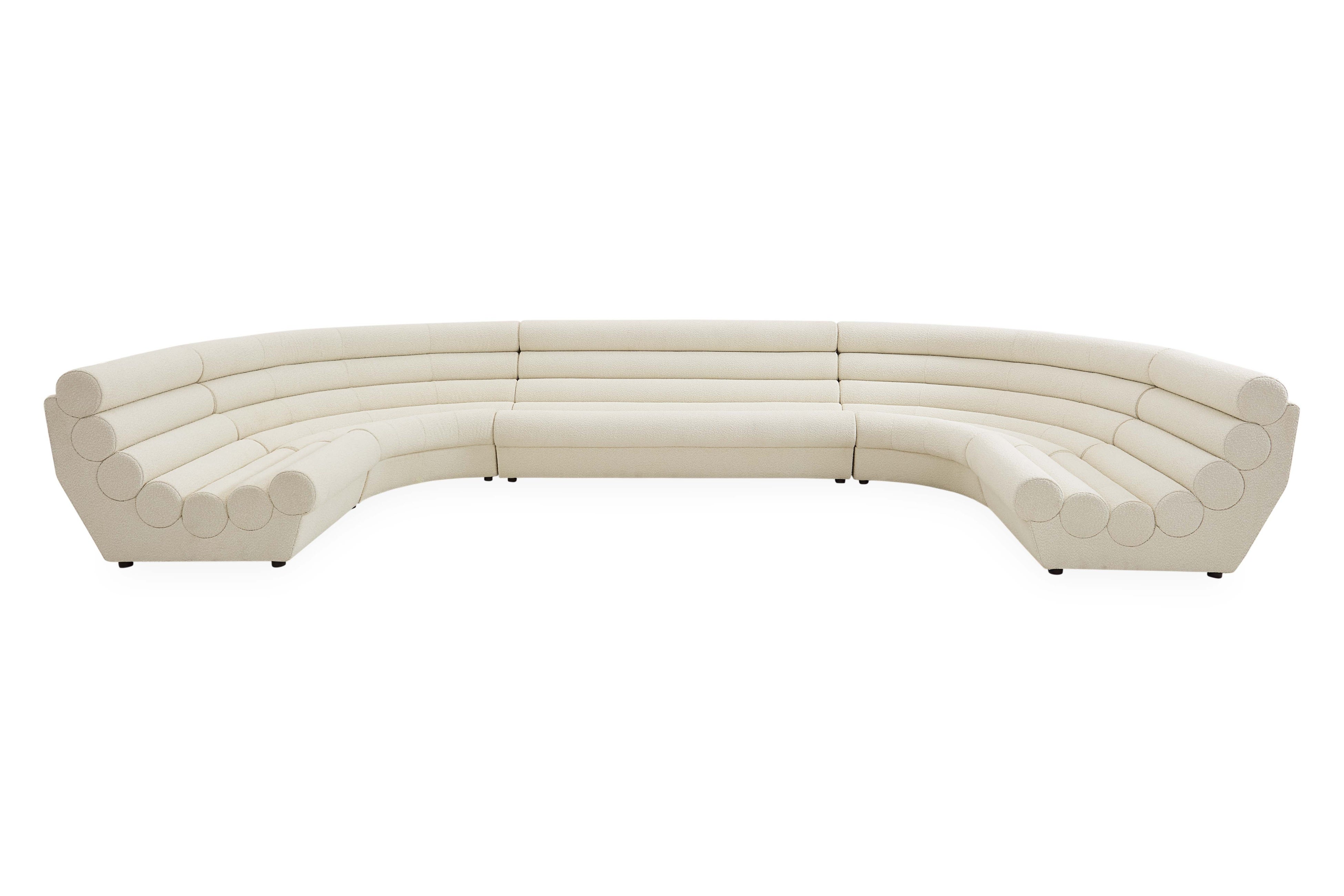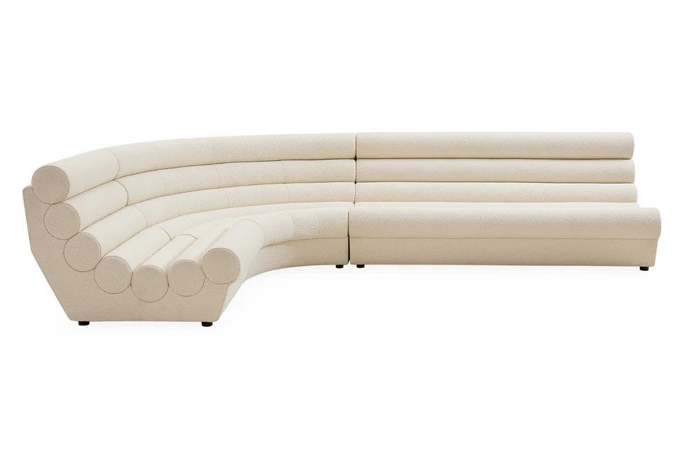 フランス1950年代のラウンジ文化から着想を得たソファです。チューブを積み重ねたような深い溝のデザインは、見る角度によって彫刻作品のように表情を変えます。しっかりとしたクッションと、内側に向かってカーブした背もたれは、自然と身を預けたくなる座り心地を実現します。張地には、業務用レベルの耐久性とお手入れのしやすさを兼ね備えたブークレ生地を使用。ご家庭でも安心してご使用いただけます。