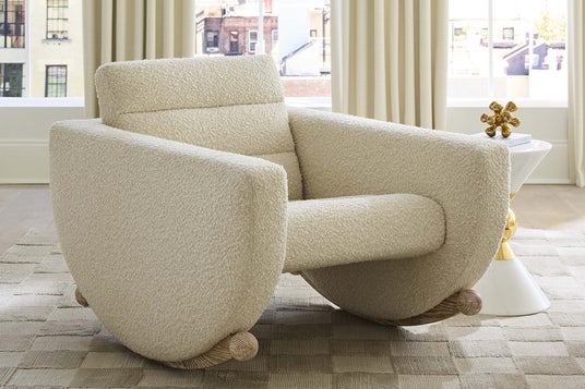 従来のロッキングチェアにある重厚感を排し、現代のインテリアに自然に馴染む一脚。半月型のアームや低く丸みを帯びたフォルムが軽やかな印象を生み出します。ホワイトオーク材のそり状の脚がやさしく心地よい揺れを実現。張り地にはブークレ素材を採用し、柔らかな風合いと防汚加工による実用性を両立しています。北欧スタイルのリビングや子ども部屋にも馴染むニュートラルカラーと彫刻的なディテールが特長です。