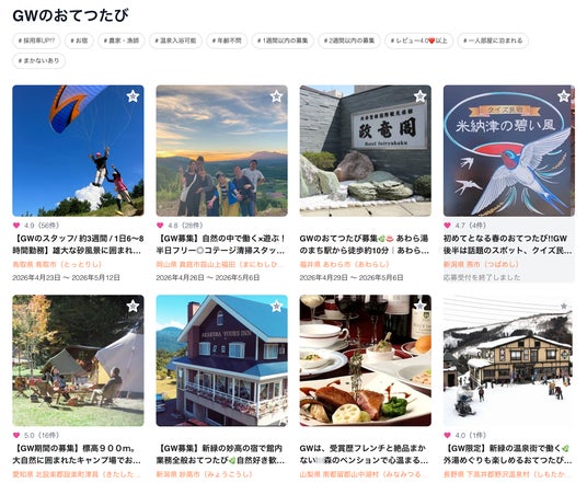 お手伝いと旅を掛け合わせた人材マッチングサービス「おてつたび」を運営する株式会社おてつたび(本社:東京都品川区、代表取締役CEO:永岡里菜、以下「おてつたび」)は、ゴールデンウィーク(GW)期間の観光地における人手不足解消と、物価高騰下での旅行ニーズに応えるため、本日より【ゴールデンウィーク(GW)特集 2026】を開始しました。