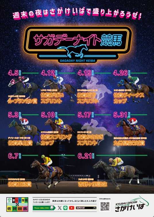 令和6年度から通年ナイター開催を実施している佐賀競馬(佐賀県競馬組合)。全国の競馬ファンの皆さまへ、より広く、より身近に、佐賀競馬のナイター開催を知っていただくために、2026年度は「サガデーナイト競馬」をキャッチフレーズにナイターを開催いたします。場内装飾はもちろん、ブランドPVやレース告知CMなど、ネオン輝くナイター仕様で華やかに、きらびやかに盛り上げて参ります。週末の夜をアツく、そして長く、お楽しみいただける「サガデーナイト競馬」にぜひご期待ください。