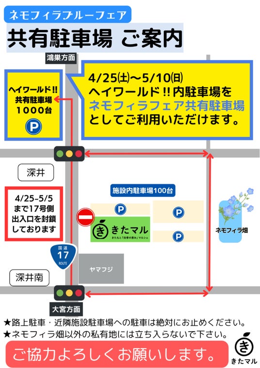 きたもと「四季の恵み」マルシェ施設内駐車場の国道17号側出入口は、安全のため封鎖します。