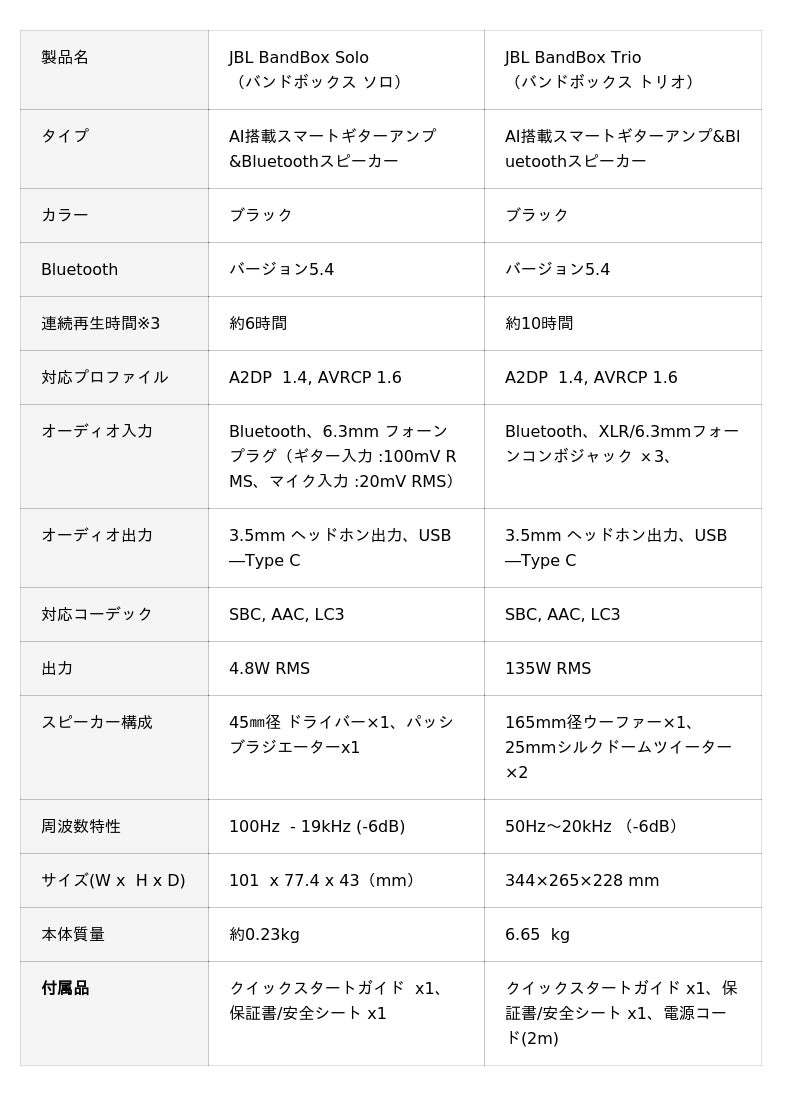 コンパクトな筐体で気軽に持ち運べる「JBL BandBox Solo」は、日常の練習や自宅での演奏を中心に、ギターやボーカルを楽しみたいすべての音楽ファンに向けたモデルです。一方、「JBL BandBox Trio」は、4チャンネルミキサーと高い出力性能を備え、バンド演奏やセッションなど、複数人での演奏にも対応します。